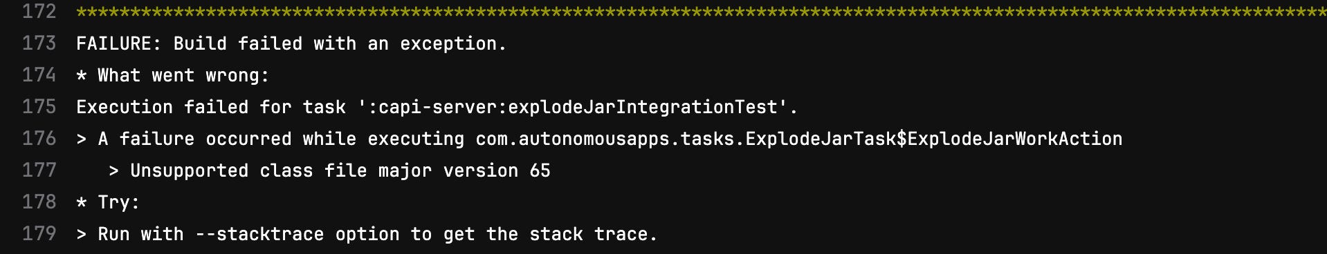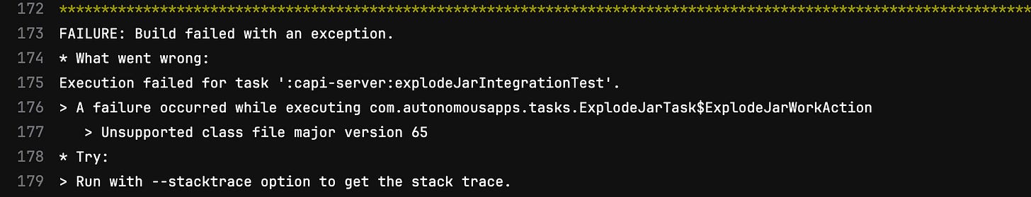 As for the Java language source and target versions, we were stuck for a long time on Java 18 even running OpenJDK 20 in production. Two main offenders - Guice and Test Retry Gradle plugin were failing our tests on Java 19 with a bunch of: