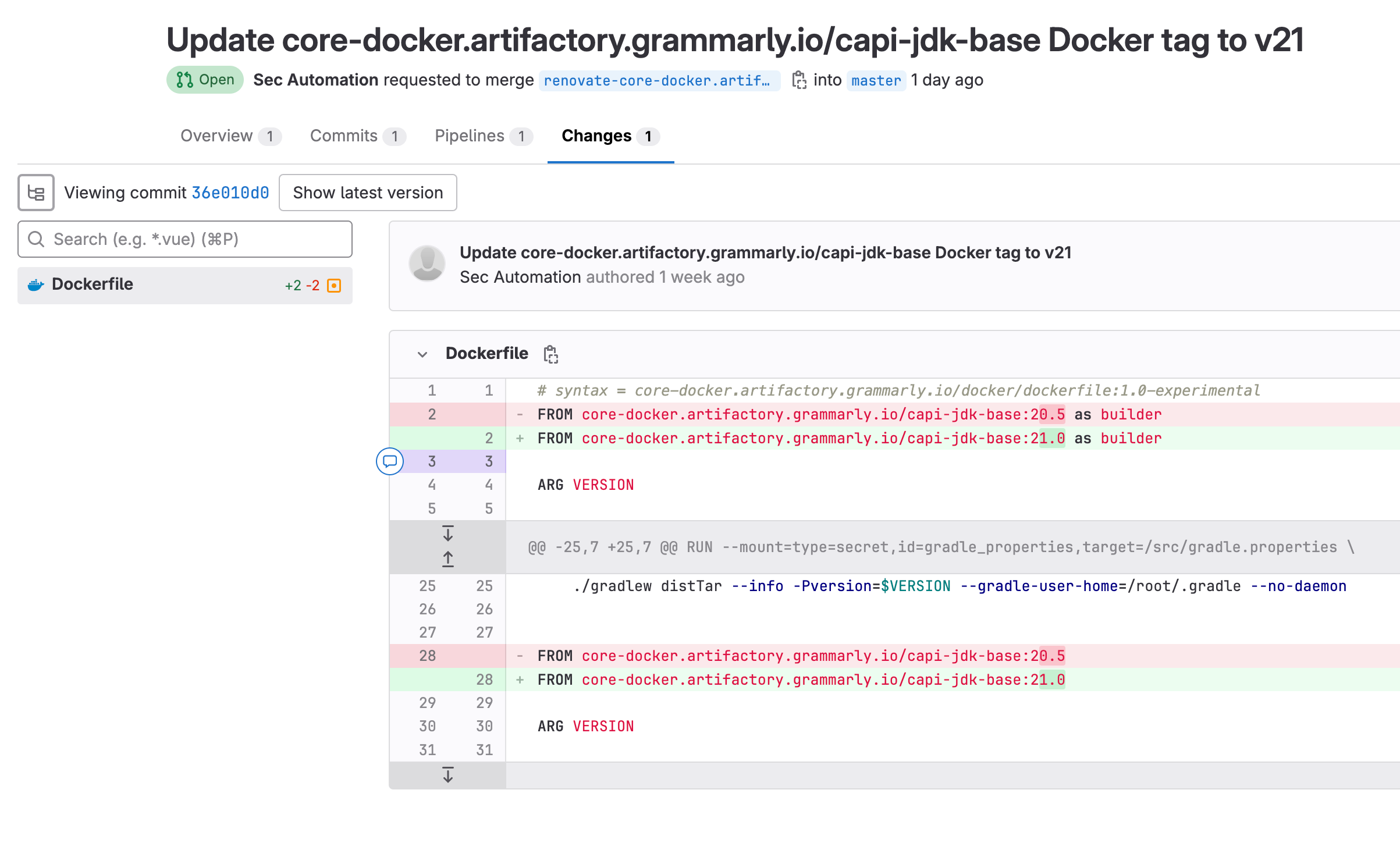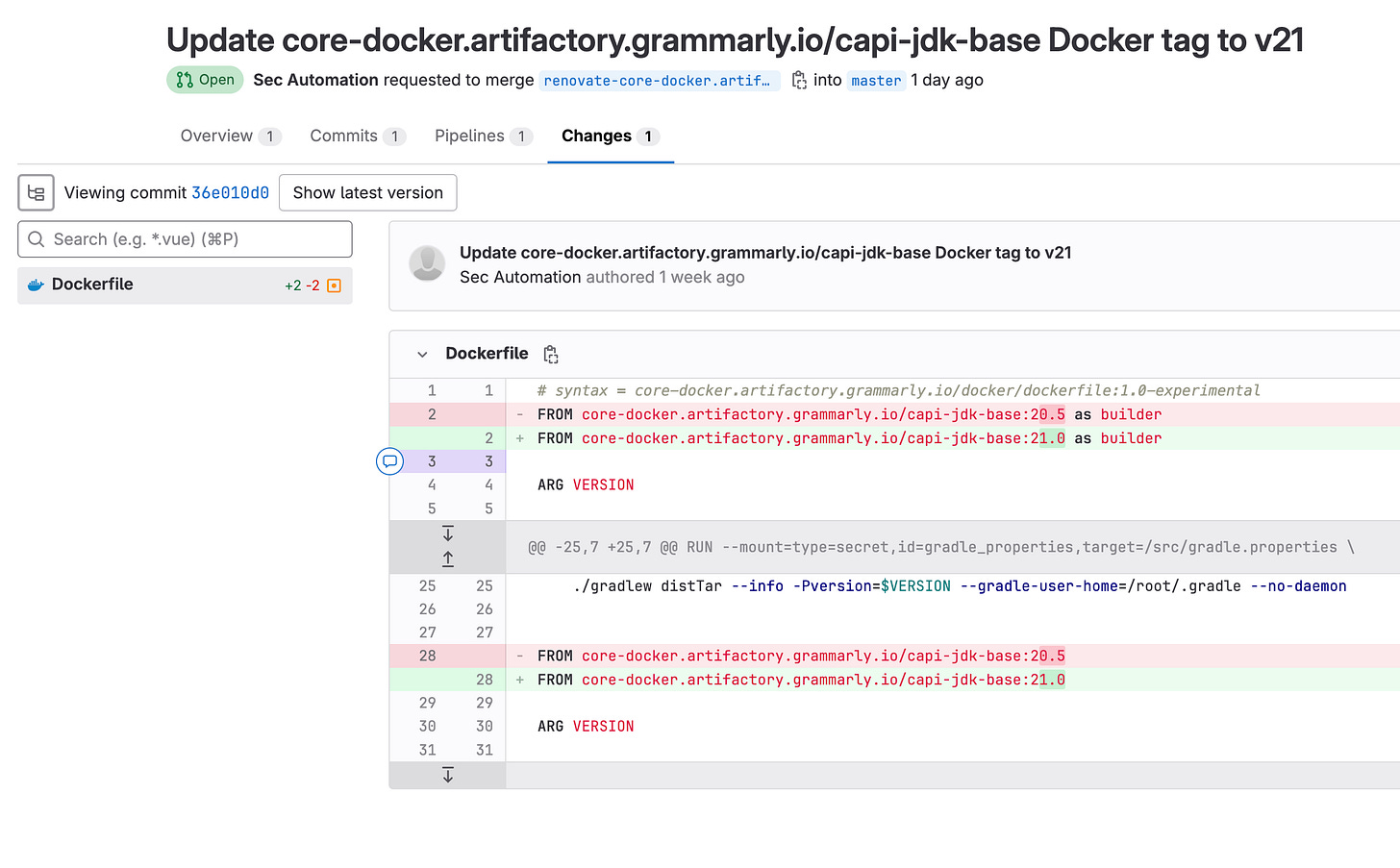 ENV JDK_DOWNLOAD_LINK="https://download.java.net/java/GA/jdk21/fd2272bbf8e04c3dbaee13770090416c/35/GPL/openjdk-21_linux-x64_bin.tar.gz"Later, the Renovate bot picks up a new version of the base image and upgrades it everywhere: