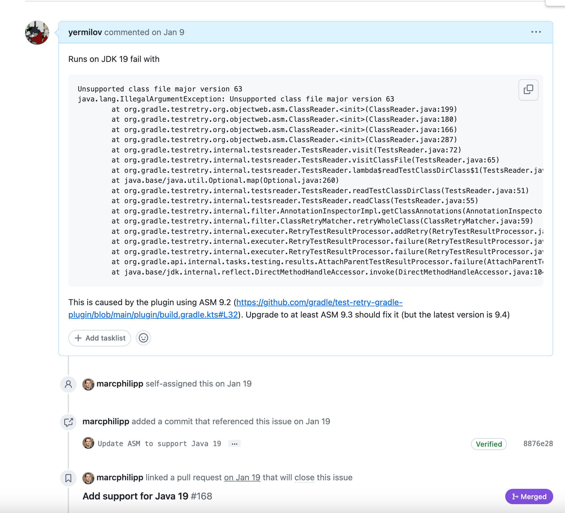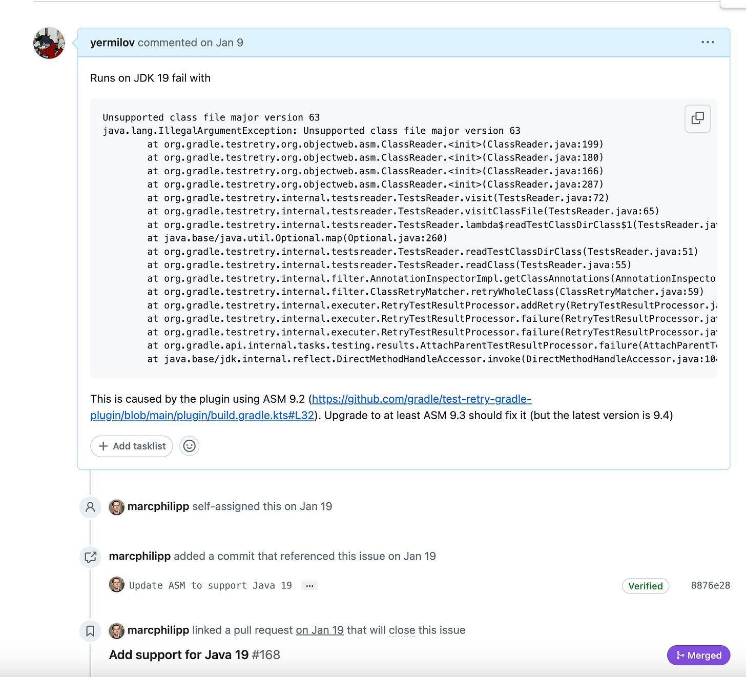 java.lang.IllegalArgumentException: Unsupported class file major versionTry to upgrade to the latest version of the library that caused the problem (the error originates from outdated ASM transitive dependency). If the problem persists - report it to library maintainers (example: github.com/gradle/test-retry-gradle-plugin/issues/165), downgrade the source and target Java versions by one, and try again until errors disappear.